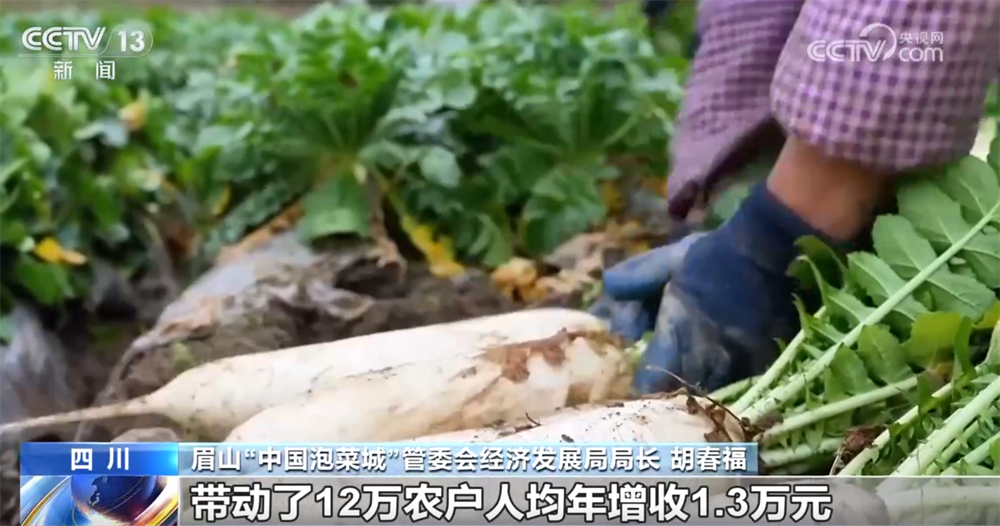 眉山“中国泡菜城”管委会经济发展局局长胡春福称:“我们专门从原料、技术和企业三个方面出台了相关的文件和帮扶措施,通过企业+合作社+农户模式,带动了12万农户人均年增收1.3万元。目前,全市泡菜全产业链产值已经达到220亿元。”