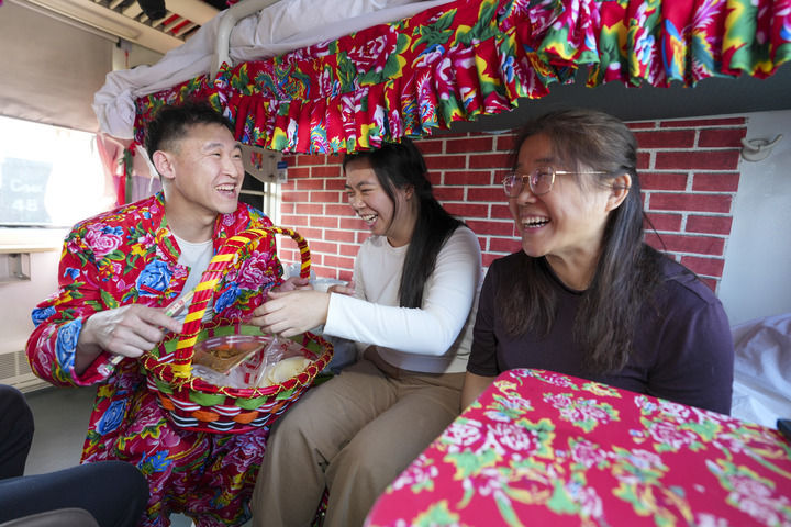 2月4日,在K7103次“列车大集”卧铺车厢内,身穿民俗服饰的乘务人员为旅客赠送煎饼。新华社记者 王松 摄