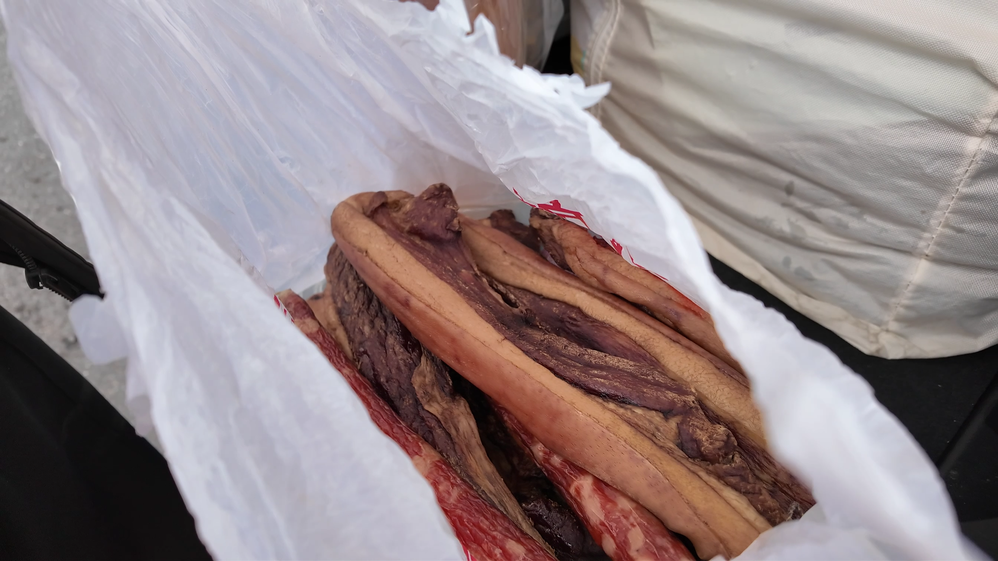 而来自贵州毕节的管毓寿,后备箱里藏着一份“硬核”的家乡味——一条三十多斤的火腿。“老家自己做的,用盐腌好,然后挂起来,放得越久越好吃。”他费力地搬出火腿,言语间满是对家乡味道的眷恋。“外面的火腿跟老家的不一样,家里面是用粮食喂的,吃起来就是家的味道。”