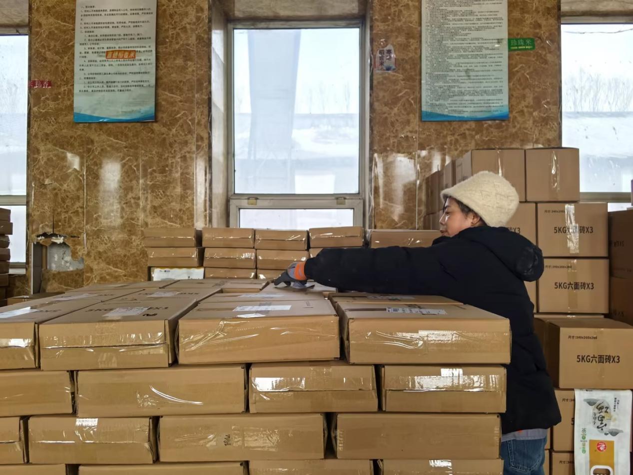 图为黑龙江硒谷米业仓库中员工正在打包寄往全国各地的海伦大米。 中国经济网记者魏金金 摄