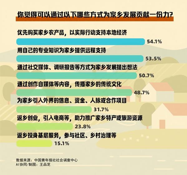 为家乡发展贡献力量,54.1%的受访青年会优先购买家乡农产品,以实际行动支持本地经济发展,53.5%的受访青年计划用自己的专业知识(如设计、电商、法律等)为家乡提供远程支持,50.7%的受访青年想通过社交媒体、调研报告等方式为家乡发展提出想法,48.7%的受访青年会通过创作自媒体内容等,传播家乡的传统文化。