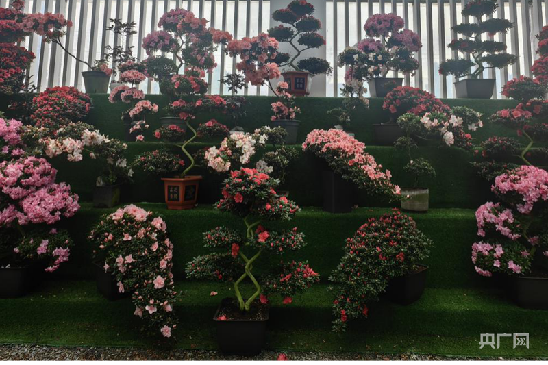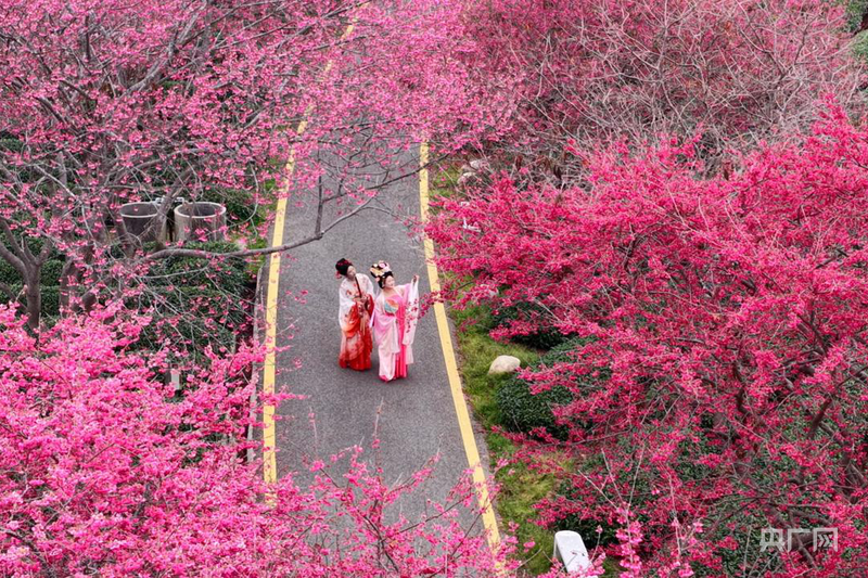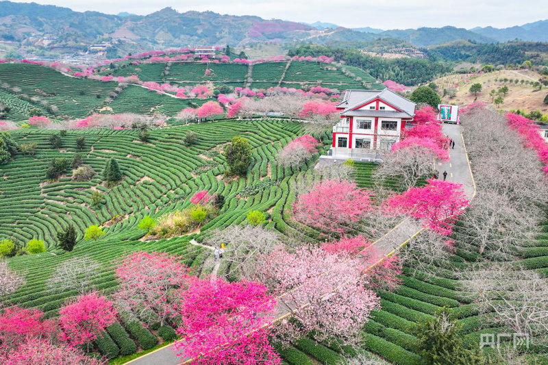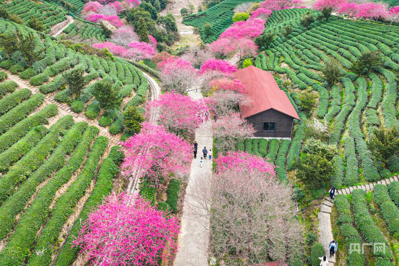 漫步于绯寒樱、中国红等42个品种的樱花树下,感受“茶绿樱红”的独特景观(央广网发 章宸睿 摄)