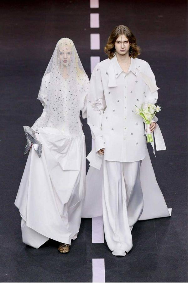 以手工钉珠流苏,手工钉羽毛工艺强化摩登时尚粗粝感,通过立体银线刺绣+钉珠呈现精致浮雕效果,用不规则蕾丝拼接打破传统西装的硬朗边界,辅以金属链条流苏增添动态垂坠美感,用前瞻匠艺,诠释可持续时尚的高级表达。