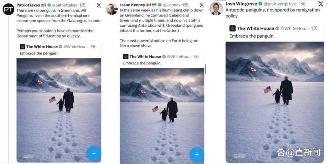 拥有46万多粉丝的X账号“Patriot Takes”也回应道:“格陵兰岛没有企鹅……也许你不应该这么快就解散教育部。”彭博社记者乔希·温格罗夫则表示:“南极企鹅也难逃重置移民的政策。”