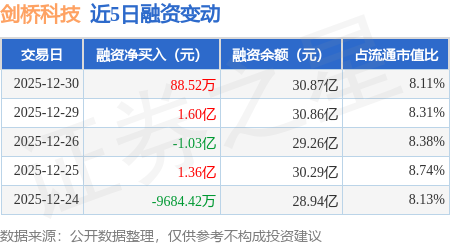 剑桥科技:12月30日融资买入671亿元融资融券余额3097亿元